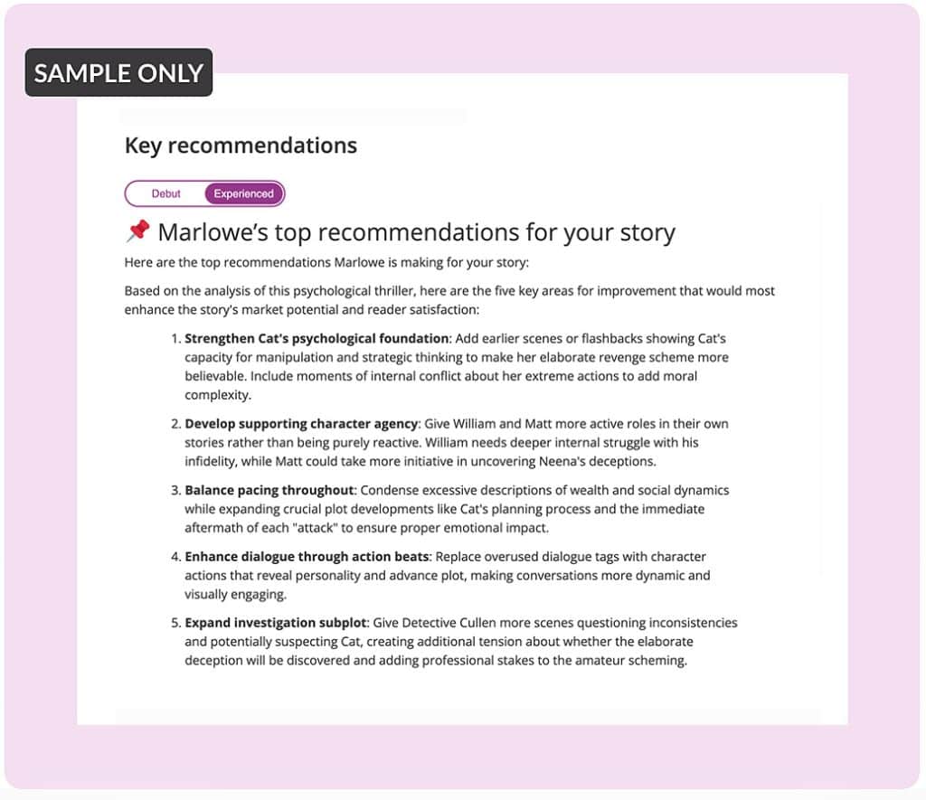 As part of a Marlowe Pro analysis, Marlowe will make a bottom-line recommendation of suggested changes in the plotline, characters, writing, pacing, or other elements of your story in a simple list.