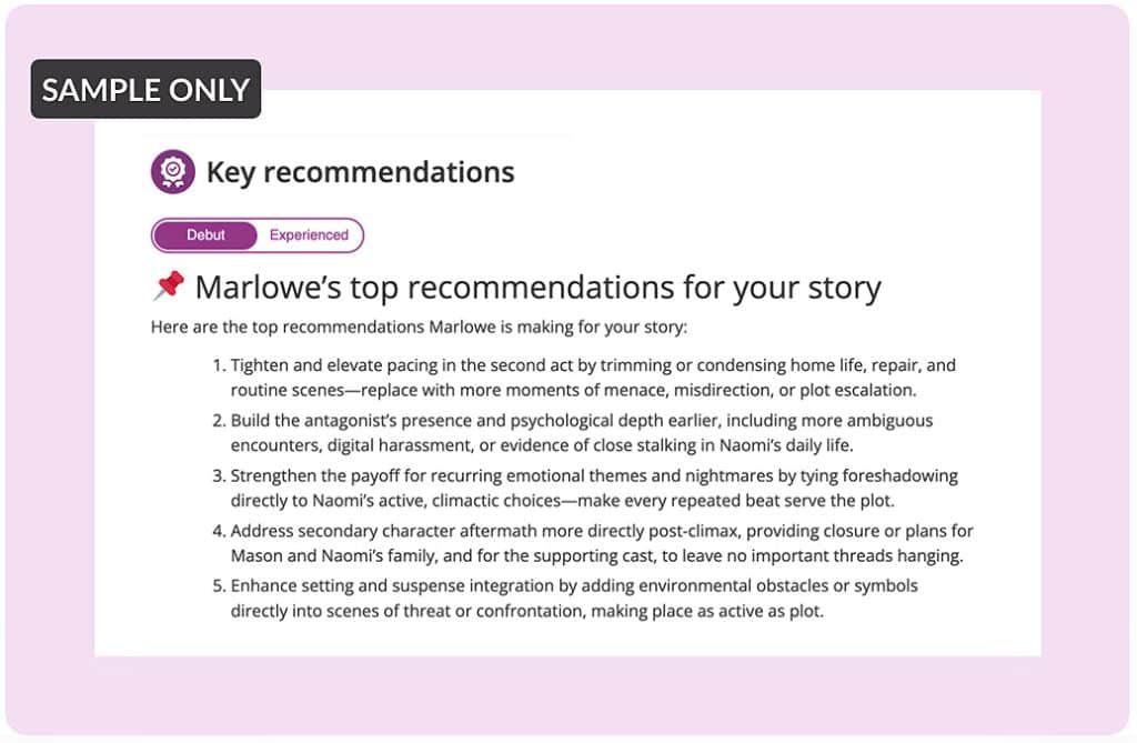 Subscribe to Marlowe Pro to see Marlowe’s key recommendations about your manuscript.