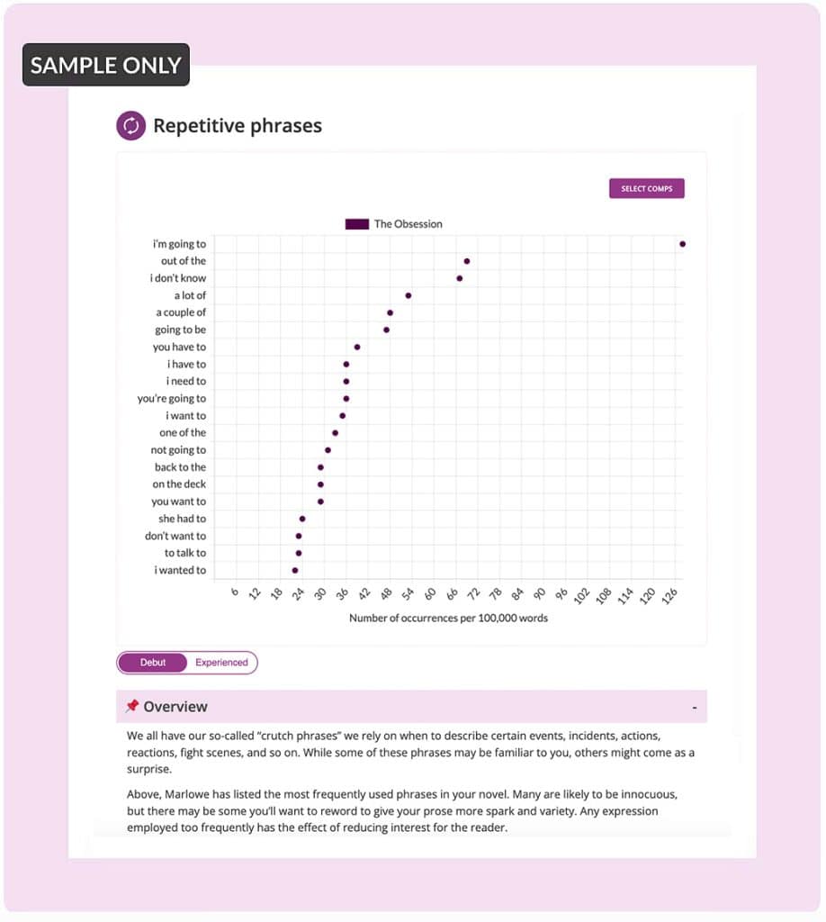 After you upload your manuscript, Marlowe will identify all the repetitive phrases, or catch phrases, that have crept into your novel. In Marlowe Pro, you’ll also be able to call up comps to see how often your favorite authors use favorite phrases.