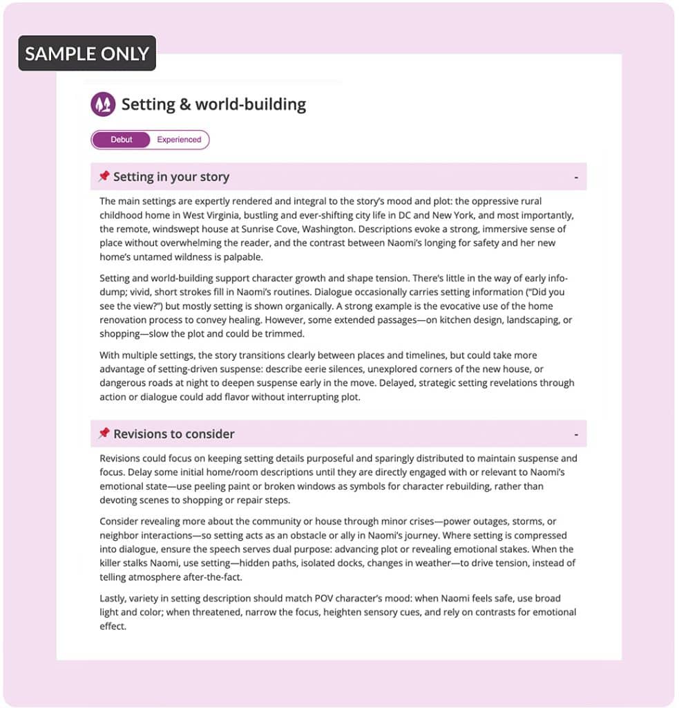 Our AI will analyze the main settings found in your work and assess whether the depictions of the settings and the world-building were handled effectively. Placement is also a key consideration. Does the world-building delay the action at the beginning of the story? Could some of the setting be communicated through dialogue rather than narrative? Our AI will provide suggestions of on how this component of the story could be improved.