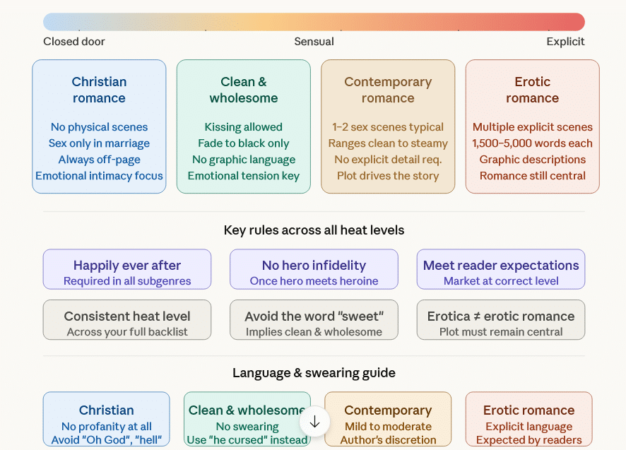 Heat level refers to how explicitly physical intimacy is portrayed in a romance novel. At one end of the spectrum, Christian and clean and wholesome romance keeps all physical acts entirely off the page. At the other, erotic romance features long, graphic scenes as a central part of the reading experience. Contemporary romance sits in the middle but has shifted considerably toward the explicit side in recent years. Fifty Shades of Grey opened the door for indie authors to push boundaries traditional publishing once held firmly in place.