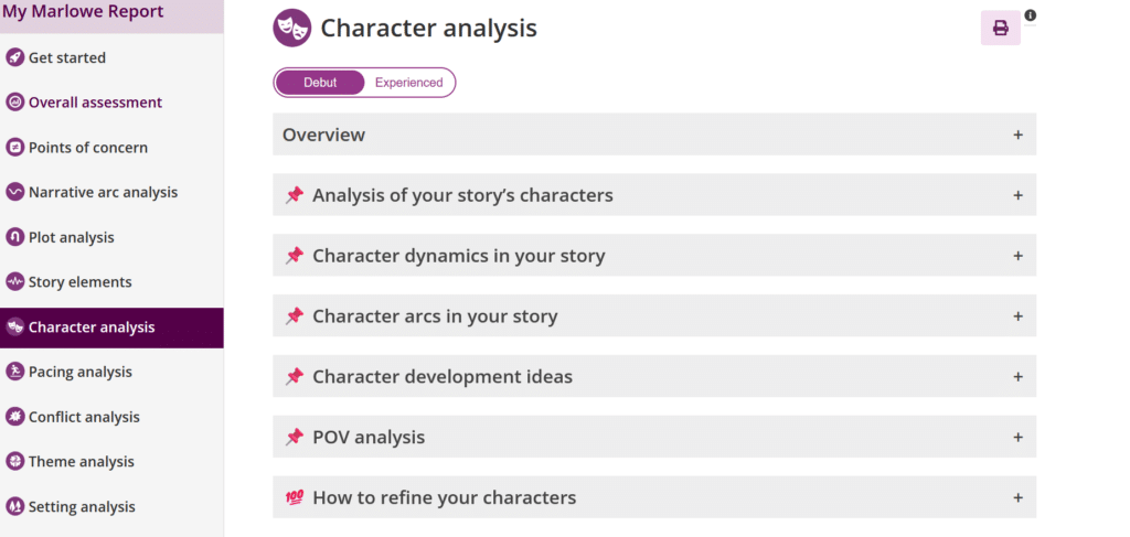 When I need an objective review of my work in progress or finished novel, I turn to Marlowe, the fiction-savvy artificial intelligence from Authors A.I. The character analysis gives you an overview of their behavior through your work. But as to whether you’ve stuck to your rules? That’s down to you.